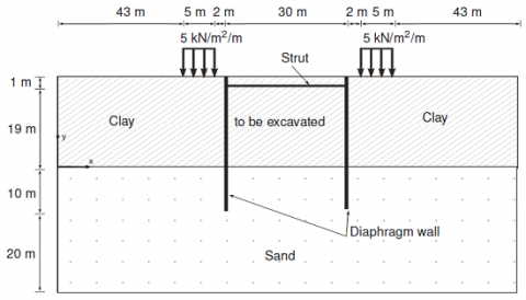 This tutorial concerns the construction of an excavation close to a river. The excavation is carried out in order to construct a tunnel by the installation of prefabricated tunnel segments. The excavation is 30 m wide and the final depth is 20 m. It extends in longitudinal direction for a large distance, so that a plane strain model is applicable. The sides of the excavation are supported by 30 m long diaphragm walls, which are braced by horizontal struts at an interval of 5.0 m.