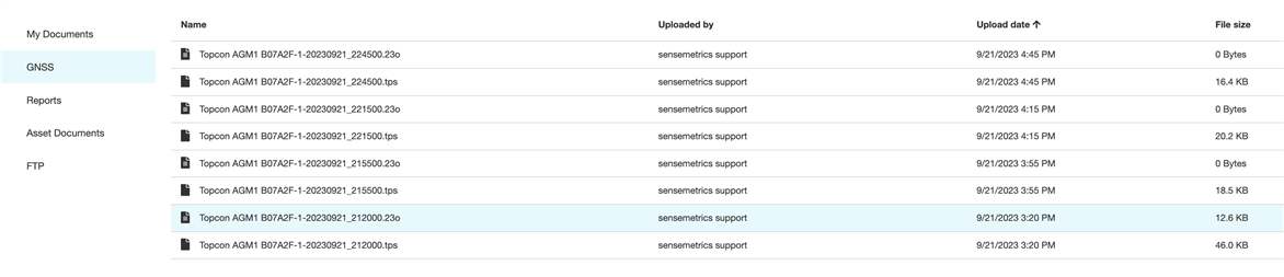 Data Files in Documents Module- After a receiver has been added, a new window will become activated in the Documents module. Within that window, a folder will be created for each receiver added to the project. Once the coordinate sensor begins populating with data, files will begin being generated in the receiver folder, illustrated below. Two GNSS data files will be generated, one in manufacturer-specific binary format (TPS), and ASCII-based RINEX file which can be used for data retention or processing within a third-party software.
