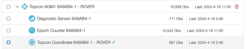 Data Stream- Once connected, the epoch sensor will begin collecting data first. The Diagnostic sensor and Topcon coordinate sensors will post data in accordance with the set device sampling interval.