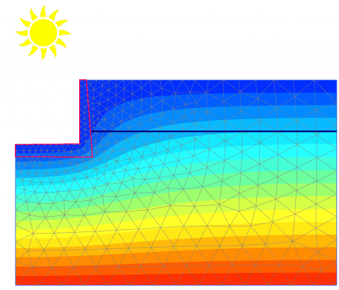 A navigable lock is temporarily 'empty' due to maintenance. After some time there is a significant increase in the air temperature, which causes thermal expansion of the inner side of the lock, while the soil-side of the concrete block remains relatively cold. This leads to backward bending of the wall and, consequently, to increased lateral stress in the soil behind the wall and increased bending moments in the wall itself.