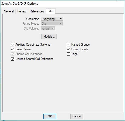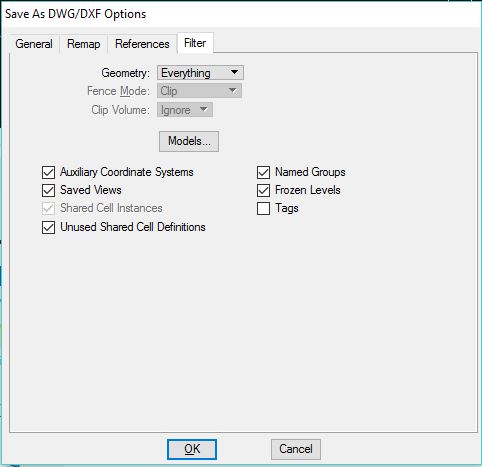 Non-Default Models Attachments-Controls how attachments to non-default models are handled when you save a DGN file to a DWG/DXF file. AutoCAD is limited to one default model per file with one or more sheets ("paper space" models) displaying views of that model. AutoCAD's XREF attachments can only display the default model.