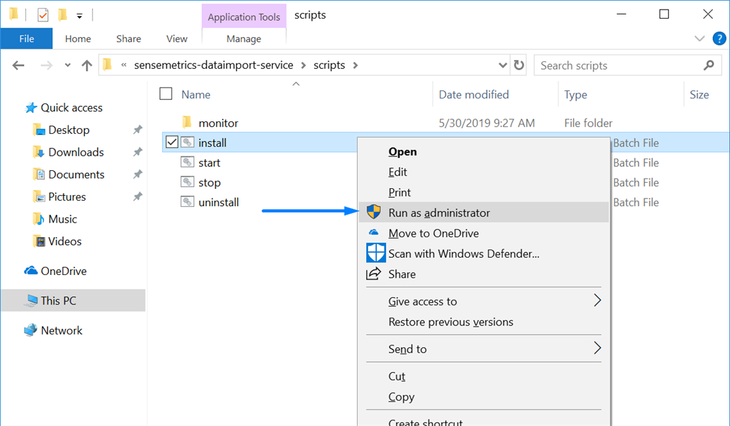 2. Open the scripts folder and run the install file as an administrator. If you do not run as administrator, the install will fail: