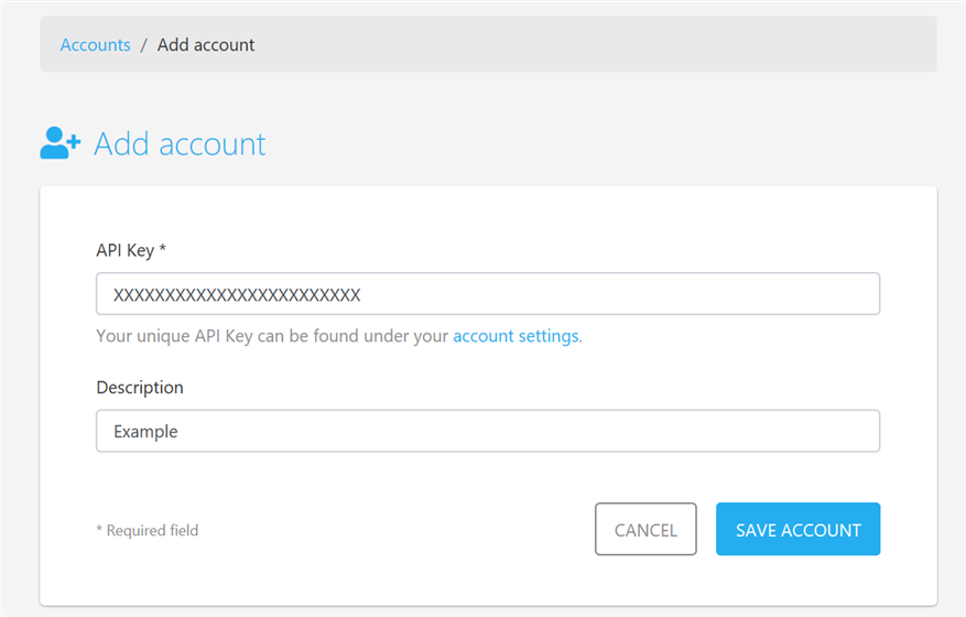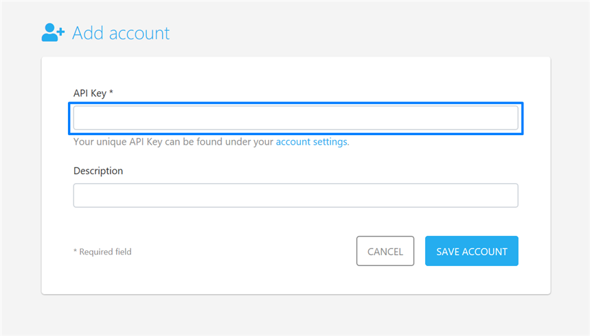 5. Paste the API key in the DataImport Service Add account page. Optionally you can also input a short description: