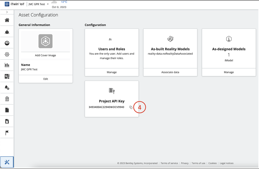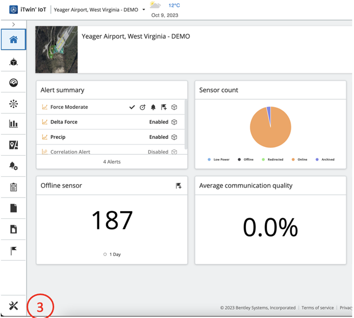 3. Navigate to the Asset that data will be pushed to in iTwin IoT. From any page, click on the "Configure" icon in the lower left side of the page. (Be logged into the account you want to link with Instantel):