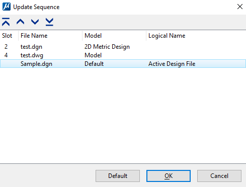 3. In the Update Sequence dialog box, select the Reference (or active file) and then click the up or down arrow buttons to move the file up or down