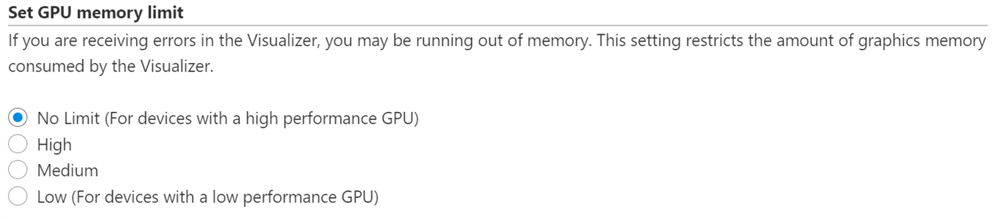 This setting allows the user to set a limit to the amount of graphics memory consumed by the digital twin viewer. This setting is useful on computers that have limited GPU resources. It is set to 'No Limit' by default.