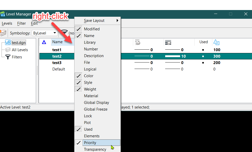You will need to make sure the Level Priority column is turned on within the Level Manager.