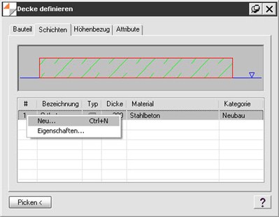 3. Gehen Sie auf den Karteireiter Schichten. Erzeugen Sie eine neue Deckenschicht über rechte Maustaste Kontextmenu: Neu. Nennen Sie die Schicht „Bezugsfläche“, als Dicke wählen Sie 1 mm.
