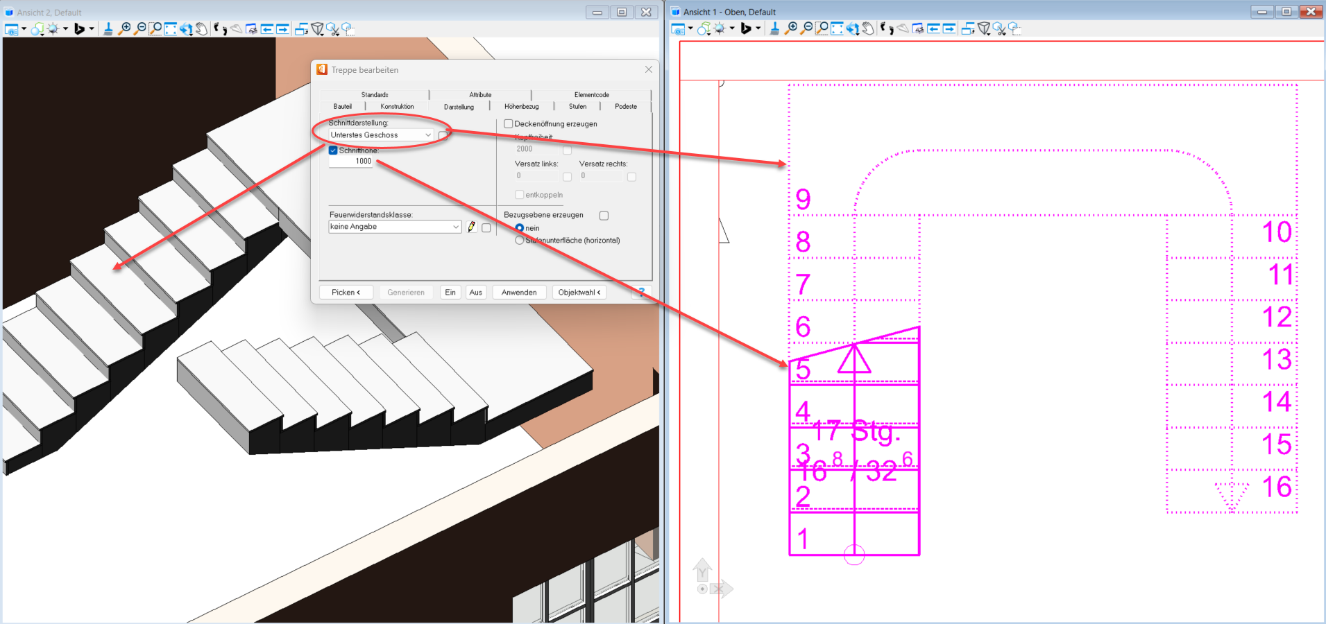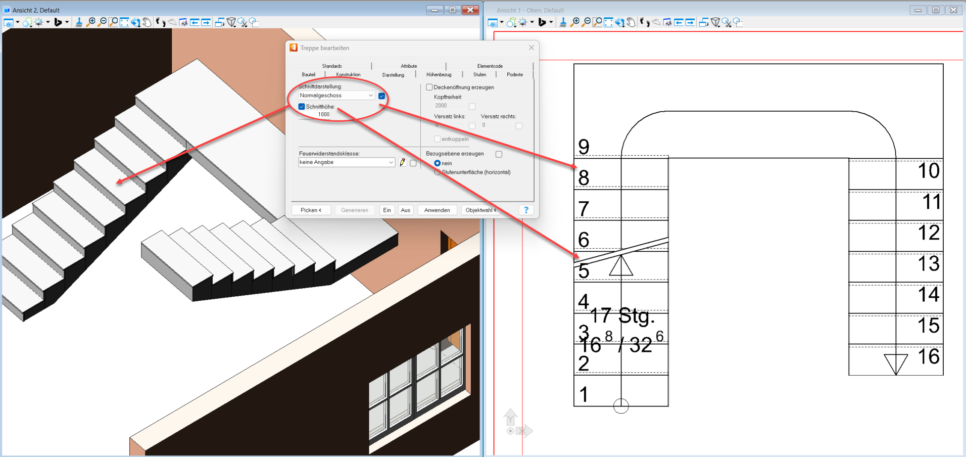 Treppen können je nach Zeichnungsfilter und den Einstellungen der Dialogboxen unterschiedliche Darstellungen haben. Ob nun die Stufen mit Untertriff, die Anzahl der Stufen, ein Geländer oder nur die Lauflinie dargestellt wird, hängt vom gewählten Zeichnungsfilter ab. Ob aber nun eine Aufsicht auf die Treppe, eine Schnittdarstellung oder eine teilverdeckte Darstellung erfolgt, regelt die Einstellung „Schnittdarstellung“ in der Dialogbox im Karteireiter „Darstellung“.