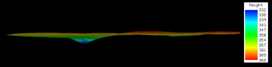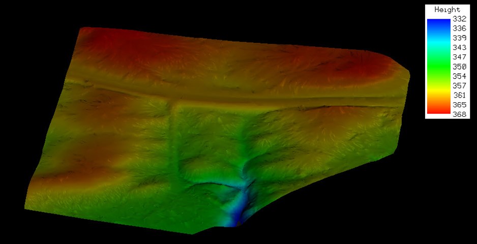 In this example the low lying area can be seen in blue and the high points shown in red, this being useful in determining where water may collect, flood by adjusting the various colours height range.