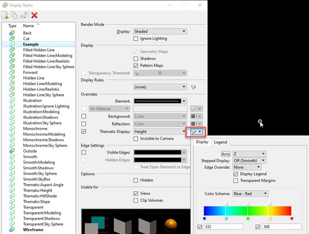 Some times it can be difficult to understand the elevation of your design, particularly when viewing your design from the Top, or Isometric view. To help visualize your model a Thematic Height Display Style can be used to display your model in banded colours with each colour representing a different elevation range.
