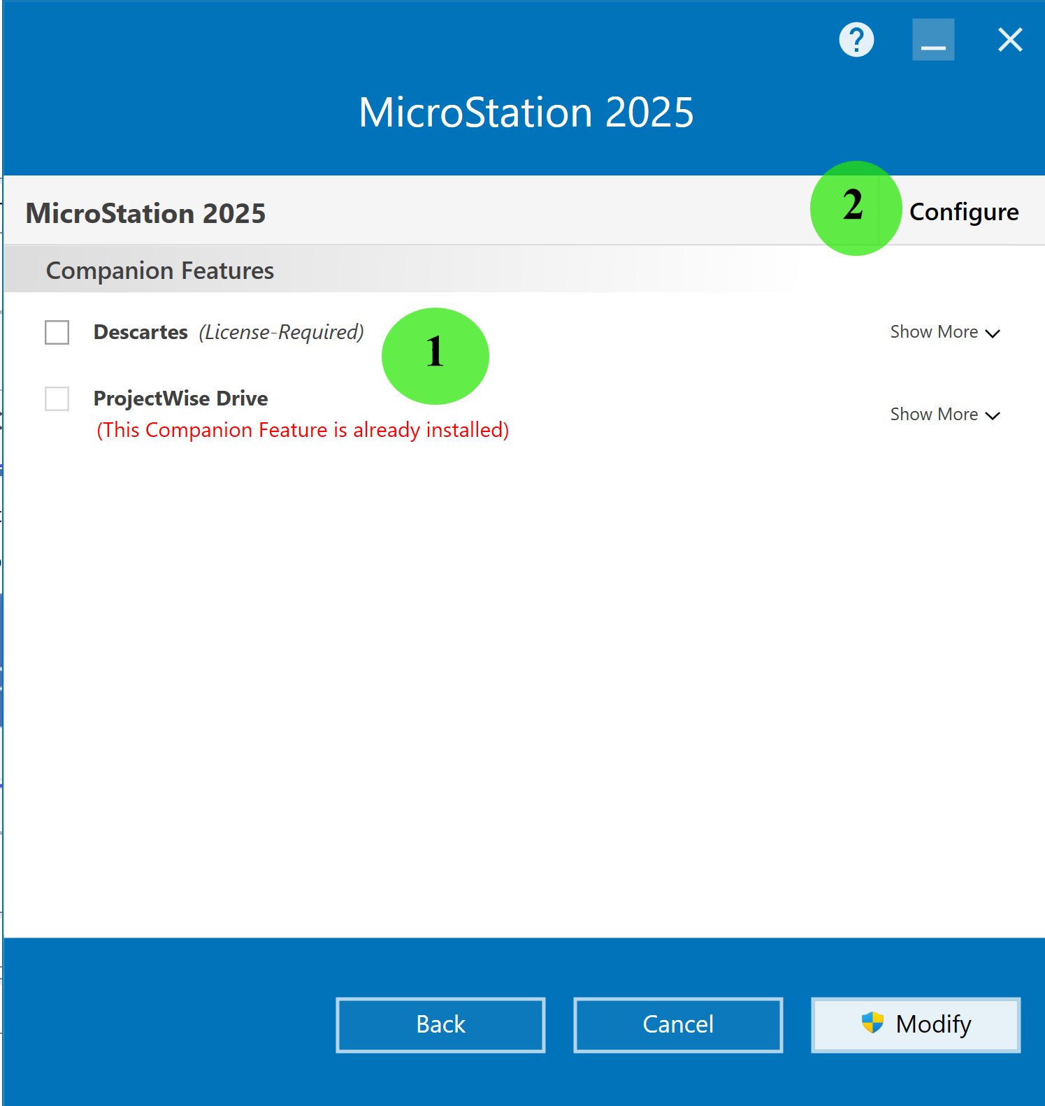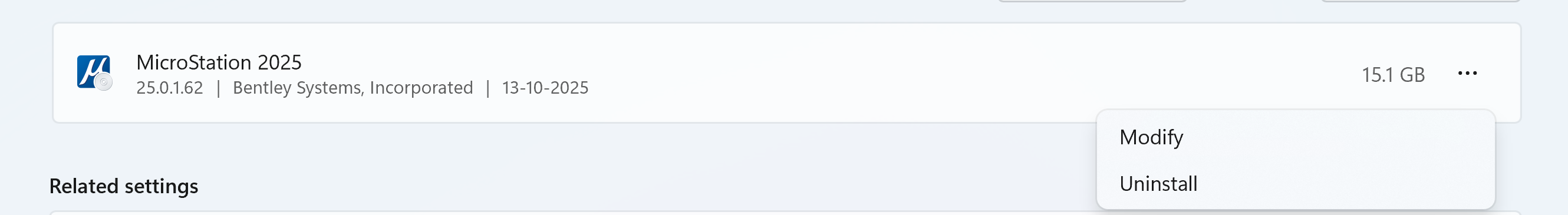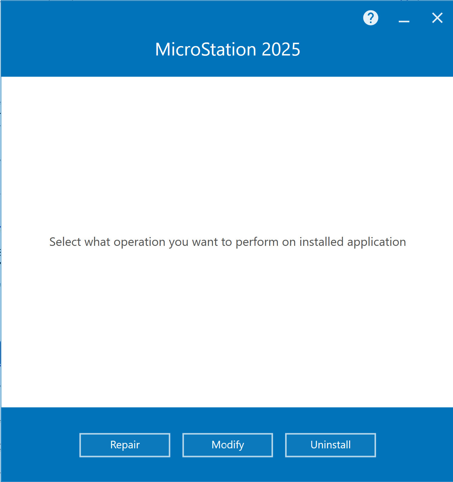 Previously MicroStation V8i could be repaired or modified from "Program and Features" in Control Panel. Changes to the Windows Installer used by CONNECT Edition products mean that the repair option is no longer available from either the Control Panel > Programs and Features or from Windows 10/11 Apps settings. Both now offer only Modify or Uninstall: