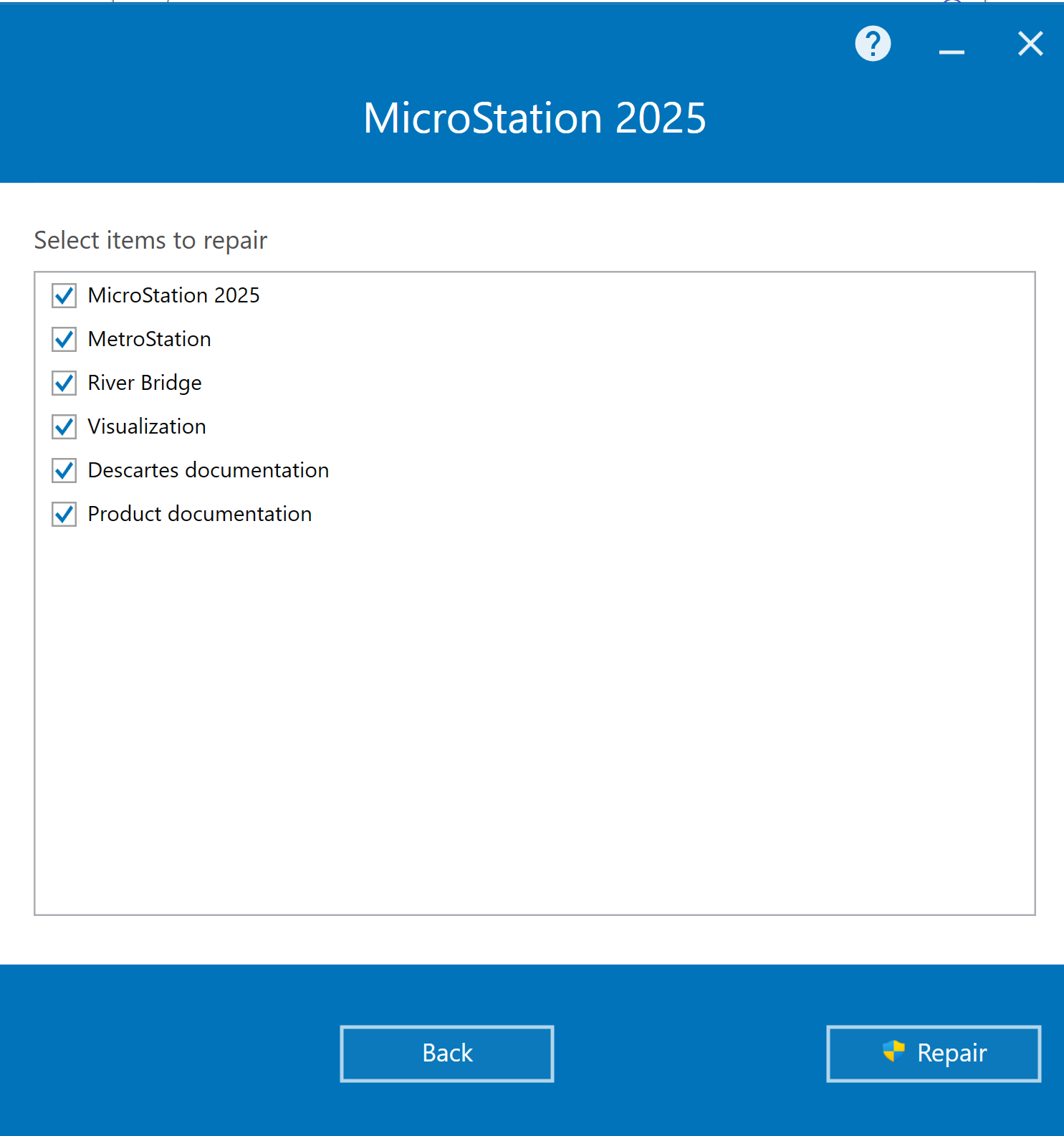 You can now repair individual components of the installation. Select item you would like to repair.