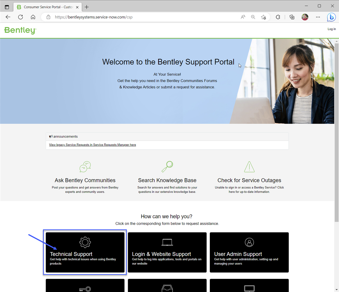 3. Click on Technical Support. If you are not signed in, you will be prompted to sign in, click the bottom "Log in with Bentley IMS"