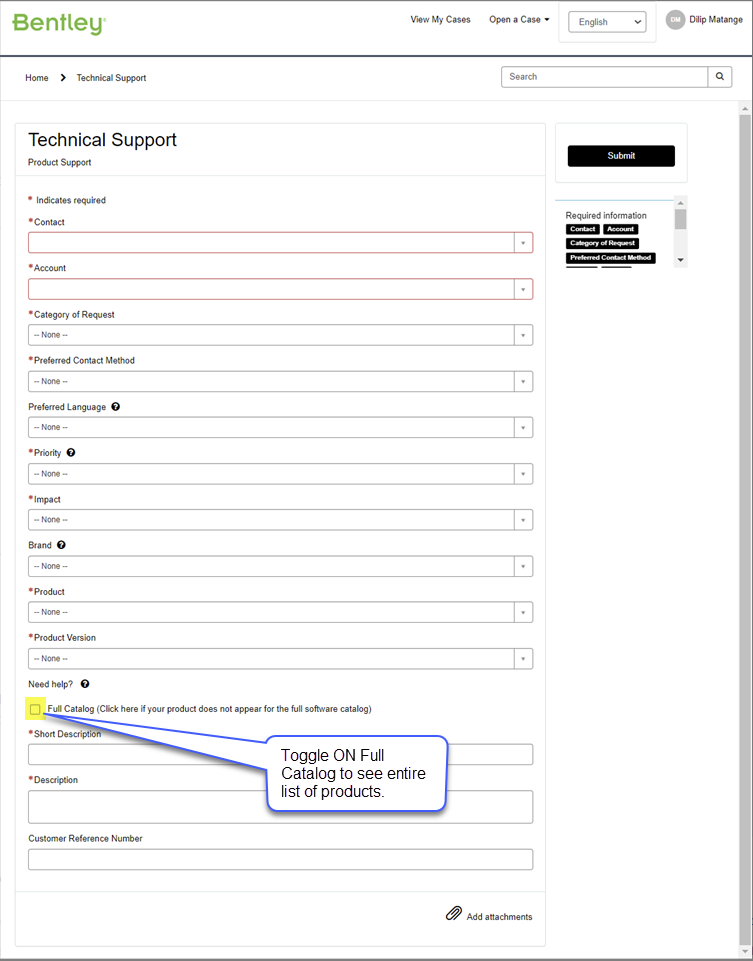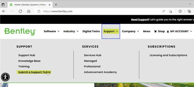 1. Go to the Bentley Website www.bentley.com and on the top right click SUPPORT > Submit a Support Ticket