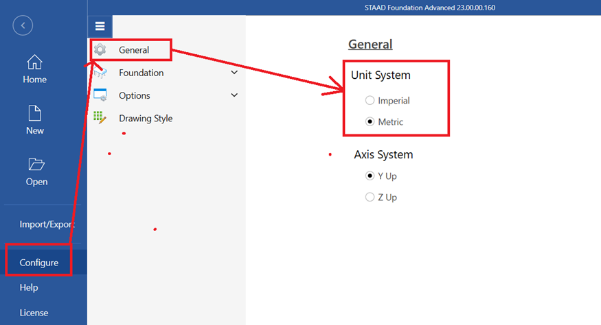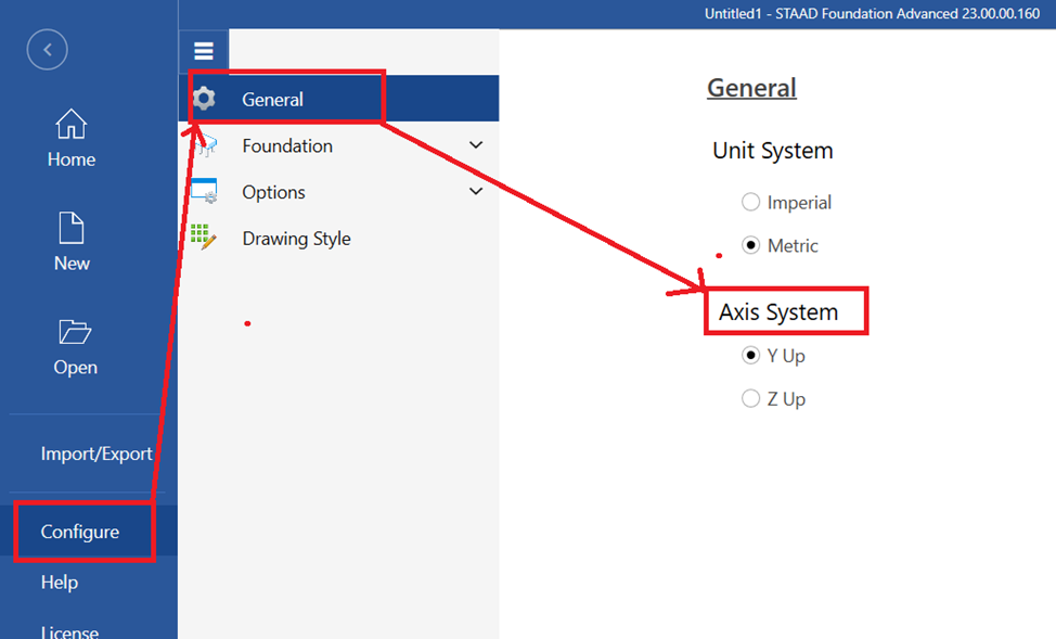 The “Configure” option allows a user to specify his default options for the model The user can specify certain settings that he thinks will apply to most of the models he create. The “Configure” option is available for the following categories – (1) General (2) Foundation (3) Options and (4) Drawing Style. Each of these categories is explained in details below.
