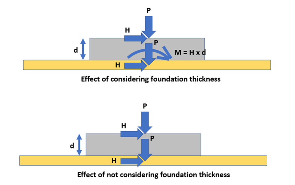 This setting wants the user to specify how the program should consider the default way of transferring horizontal force from the foundation to the soil if the force is transferred from the top of the foundation. The user is asked to specify if he would like to consider the foundation thickness while transferring the load. If so, he needs to click the radio button besides “Consider Foundation Thickness”. If the foundation thickness is considered, then the program will consider by default, one additional moment created by a horizontal force being applied to the top of the foundation. If the user wishes the program to consider, by default, only the horizontal force and disregard the moment created due to thickness of foundation he needs to click the radio button corresponding to “Ignore Foundation Thickness”. Please refer to below snap which illustrates this.