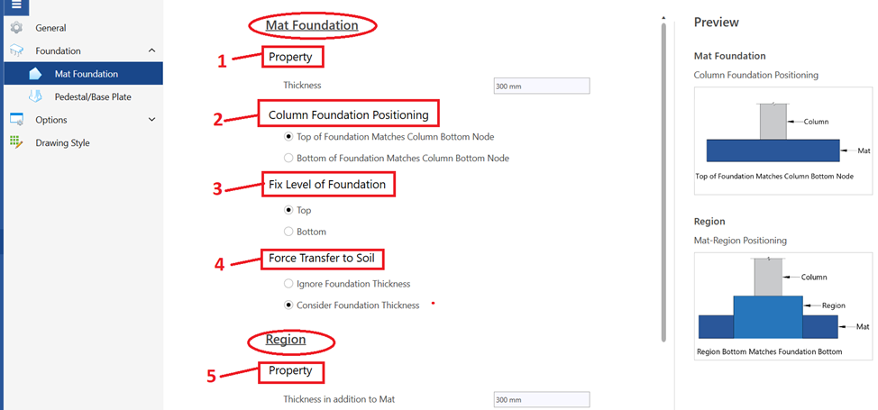 When the user chooses this option, the default mat foundation settings are displayed as shown in the below figure. The sequence of clicks to access this option is indicated by the arrow symbols. There are two main areas – (1) Editing section, where the user actually sets the default settings for the mat (2) the other is the preview section where the user can see with the help of illustration the physical interpretation of specific settings.