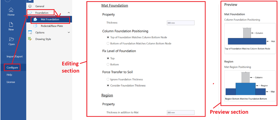 Configure > Foundation option allows the user to set default settings for modelling, analysis and design of mat foundations and pedestals. The current version handles mat foundations along with regions and pedestals on it. To understand these components and their behavior, please refer to the Technical Reference Manual.