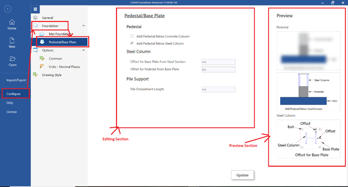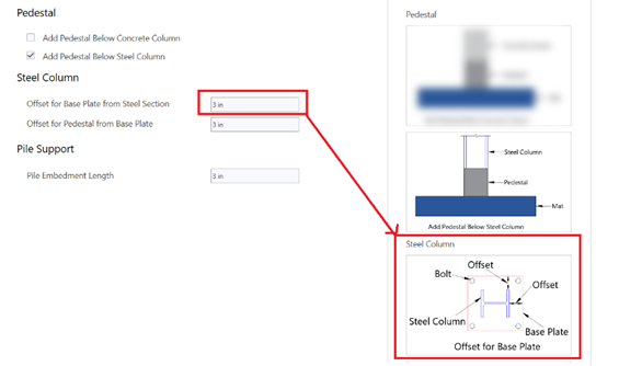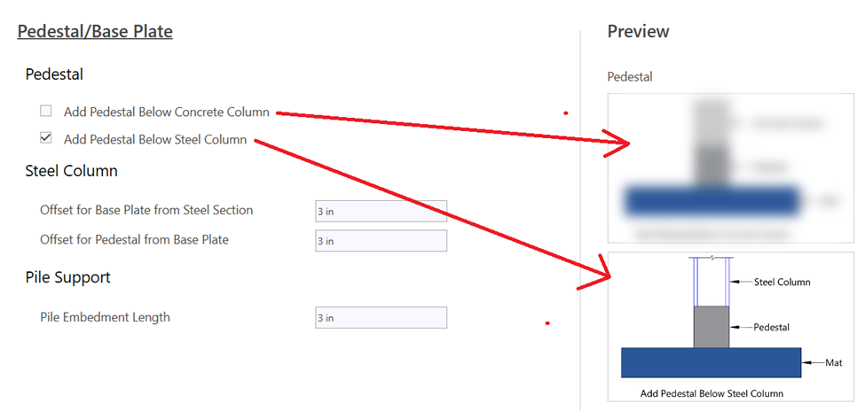 This option is also illustrated in the “Preview” section as showed in below snap. Note how the illustration corresponding to “Add Pedestal below Concrete Column” has been blurred out as this option is not chosen. The illustration will be as clear as the “Add Pedestal below Steel Column” if we choose this option.