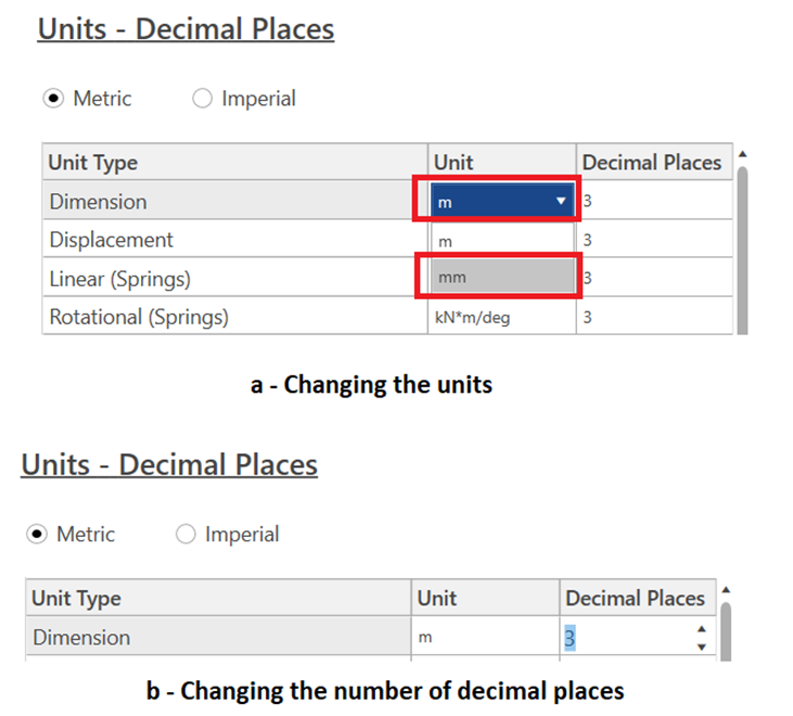 This option allows the user to set the default units and the default number of decimal places for various parameters (like dimensions, displacements, spring stiffness etc.), relevant to a specific unit system in the file. By default, it displays the same for the unit system that is set in Configure > General option, as discussed in section above. However, the user can change it if necessary.