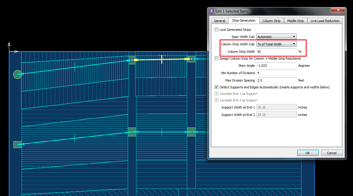 There is now a new parameter associated with Span Segment objects. This parameter is set on the Strip Generation tab of the Span Segment object properties dialog and is used for the basis of the column strip width when generating strips. The column strip width may now be specified as a percentage of the total strip width. This new option is listed as % of Total Width along side the existing options Full Width, Code Slab, Code T-Beam, and Manual.