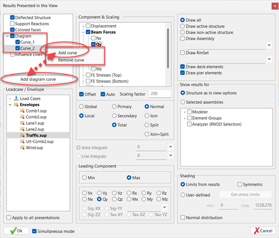 RM Bridge Results Options are definitions for the results to be presented as graphics in the current Windows view. Diagrams are additional definitions for the structure model results presentation that can be scaled and is grouped into a Diagram with its elements results as plotted curves.