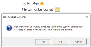 If the user has the .dgn files alongside the exported .obdx file, then OBM will show them in the project tree explorer. If the .dgn files are not available or they are stored in another location than the one used by the initial .obd file, OBD will show an alert that the file is not found. In this case, if the user: