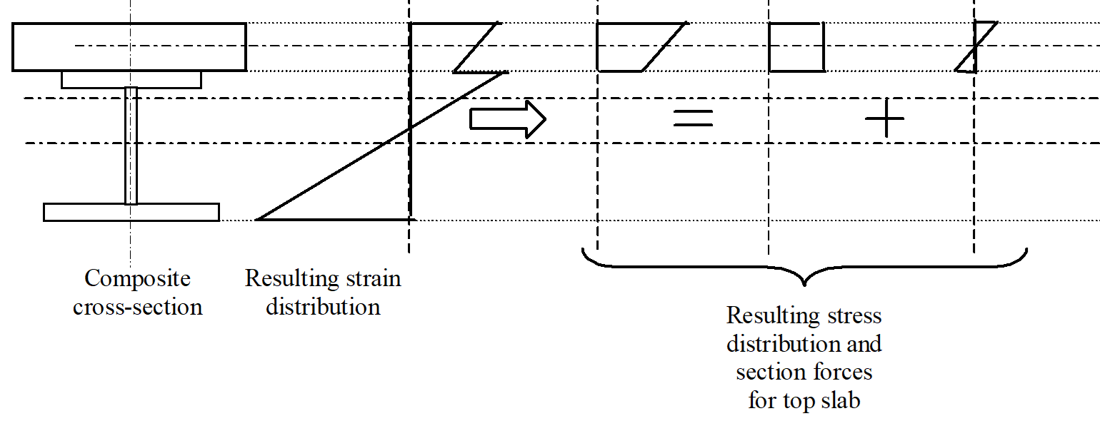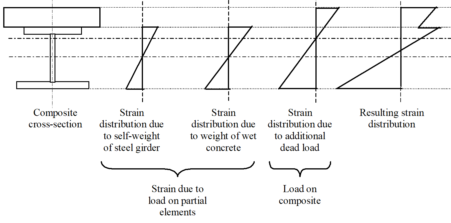 Composite structures loaded considering the erection sequence in the simulation with partially completed elements have a complex structural system that changes over time and requires a non-linear stress distribution, as shown in the picture below.