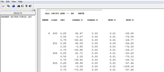 The PRINT (MEMBER) SECTION FORCES command is used to print shears & bending moments at the intermediate sections of a member. Intermediate sections must be specified using SECTION command before specifying the PRINT SECTION FORCES command. The printing is done in the output in a tabulated form for all specified cases for that specified member.