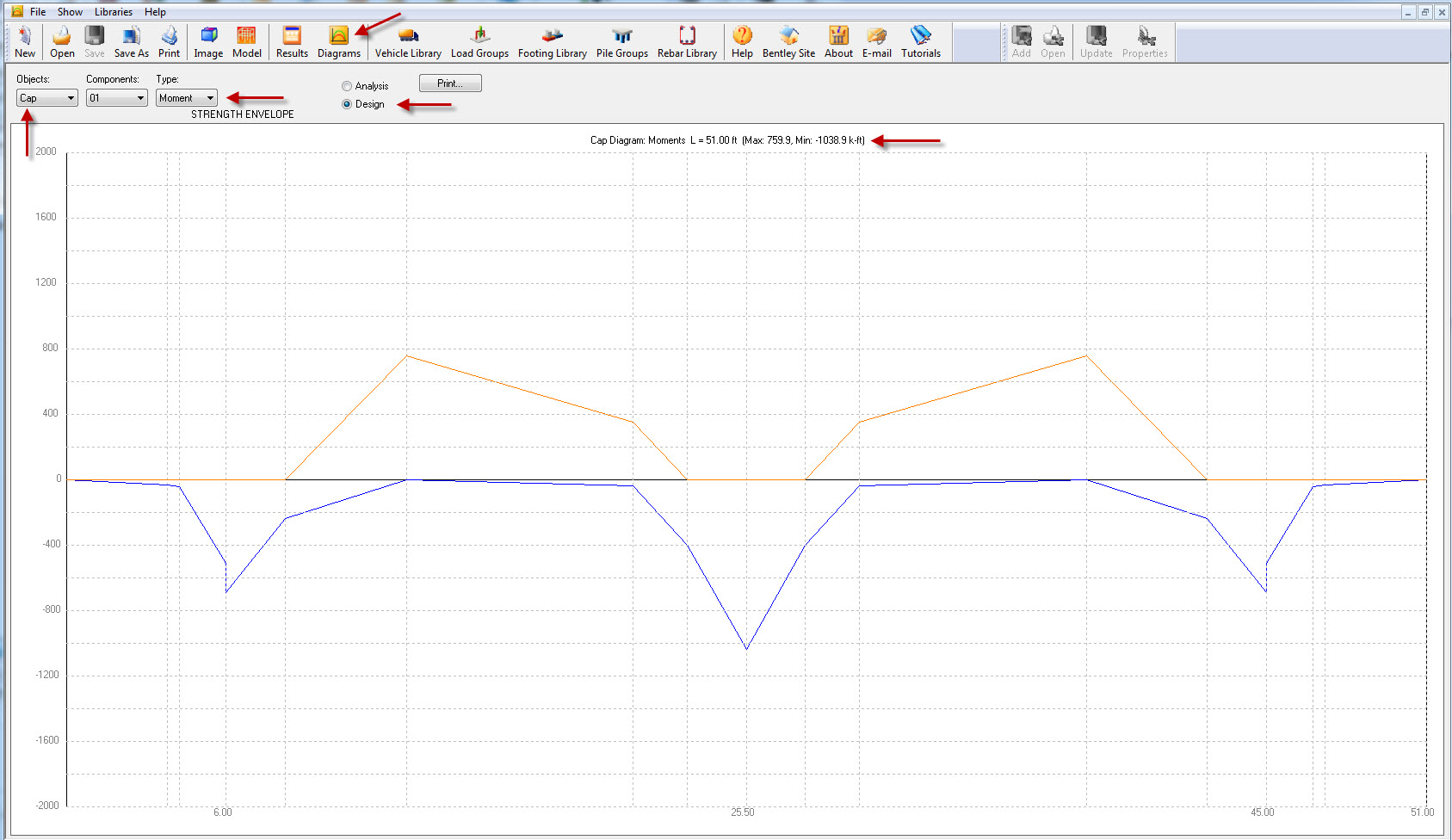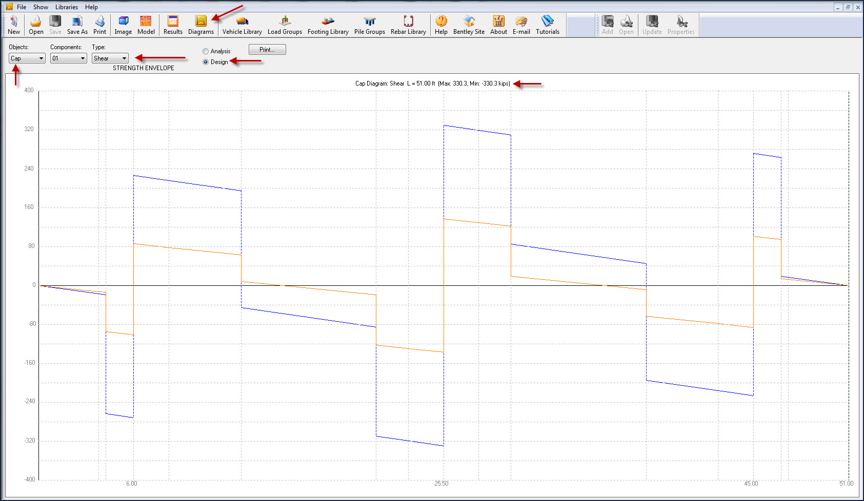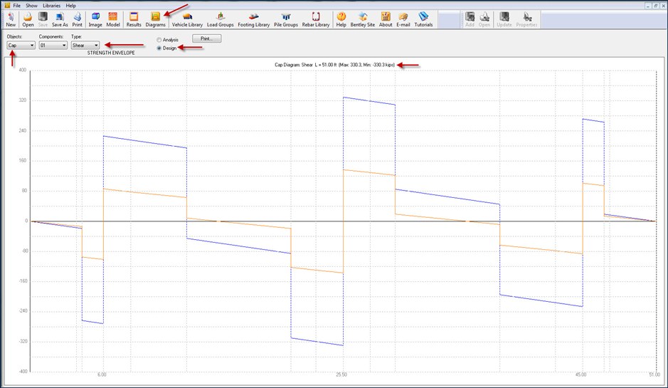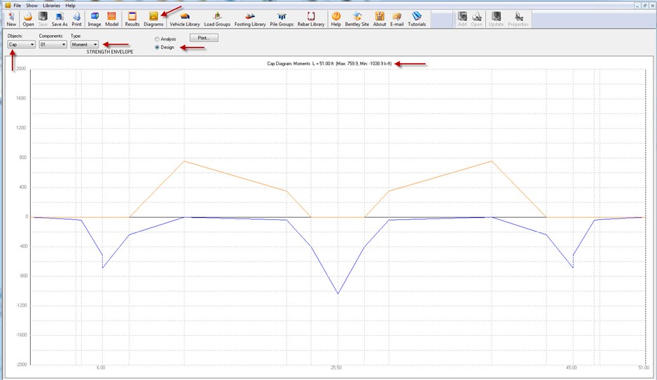 Once the user Runs the Analysis and then Designs the Pier Cap and Column then the user needs to click on "Diagrams" Option on the Toolbar. In the new window under Objects Heading the user needs to select Cap options and under Type the user needs to select Moment or Shear option and check the box right next to Analysis/Design. Then the user should be able to see the Pier Cap Moment and Shear Diagram and the user can see the Max and Min moment at the top of the screen.