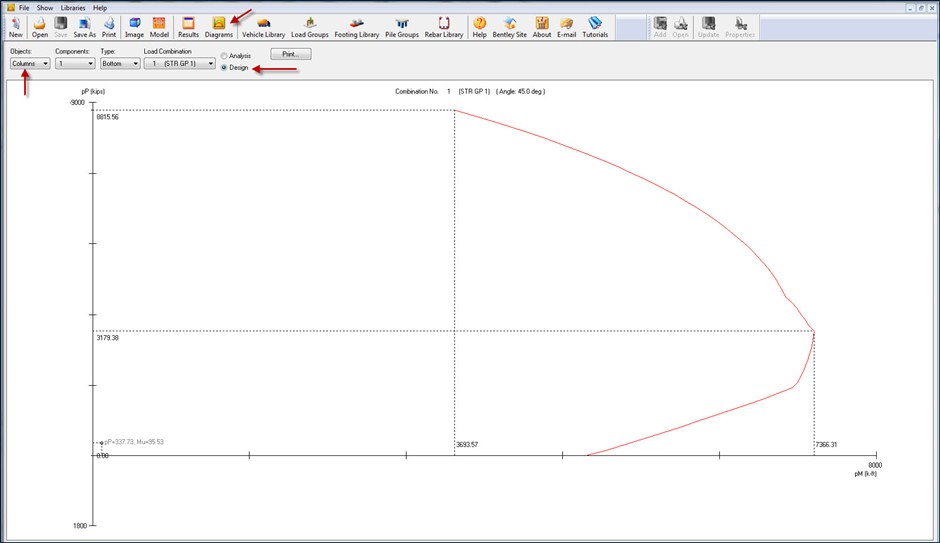 To check Column Interaction Diagram ,under Objects heading the user needs to select Columns option from the drop down menu and also the user needs to select Top/Bottom option under Type heading. The Analysis/Design of column can be checked for each Load Combination by selecting the Strength Load group under Load Combination Heading.