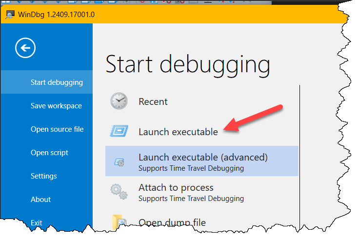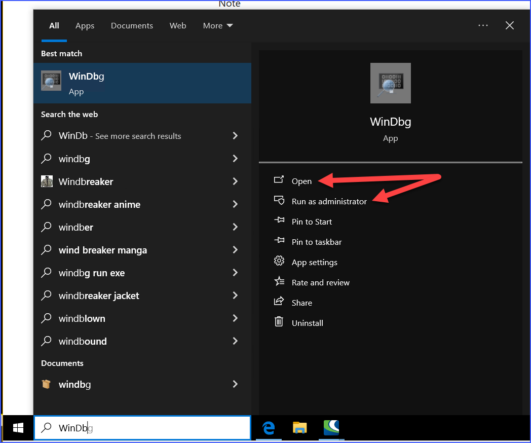 Go to Start button, type in "WinDbg" and press "Open" or "Run as Admin" option.