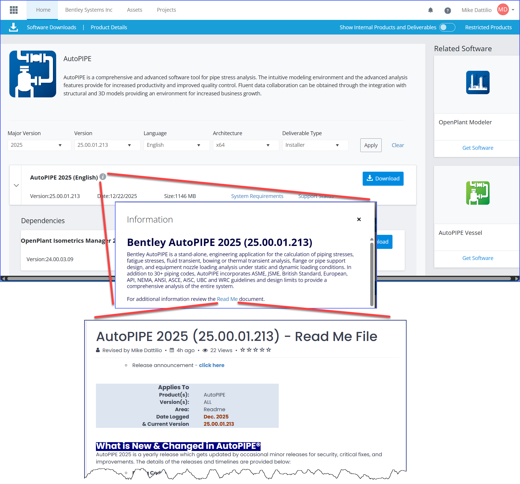 C. Details and Readme - pressing the "i" balloon will open a dialog that indicates additional details. These details contain a link to the respective Readme file on Bentley Communities