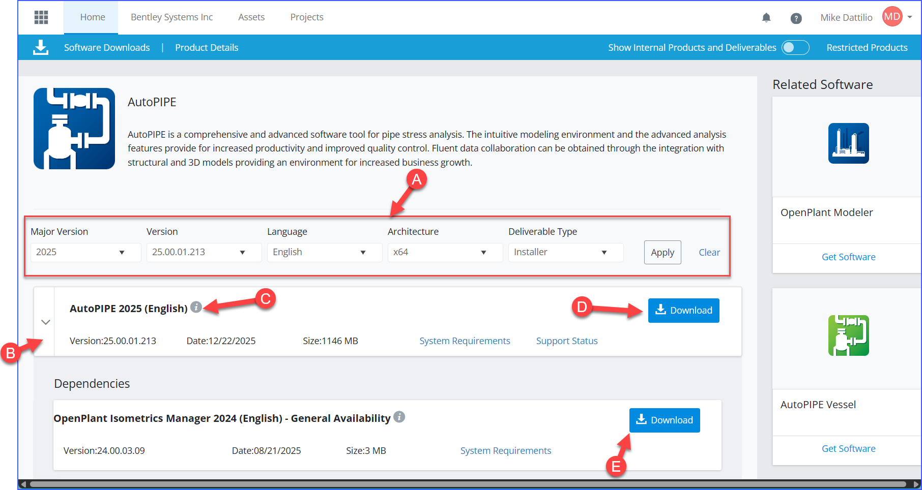 AutoPIPE is available in 4 different versions (i.e. Standard, Advances, Nuclear, and QA&R) and 1 add-on (KHK2 Add-on). These versions and add-on are controlled by the licensing inside of the application. Therefore, only need to download one edition of the software, always select the first tile labeled AutoPIPE. Again, all the feature are installed, the license selection from with in the application controls the feature availability with in the application.