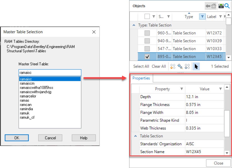 In RAM Structural System, steel section properties are defined in the Master Steel Table and the Master Steel Joist Table. The steel section properties will be pushed to the iTwin Analytical Synchronizer as Table Section and Table Steel Joist objects.