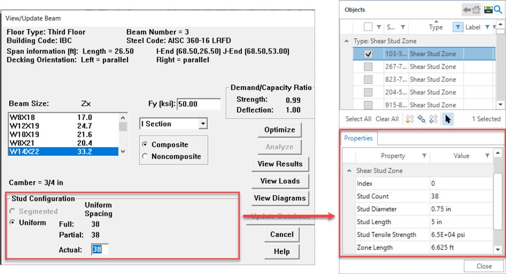 In RAM Structural System, shear studs on composite steel beams are designed in the RAM Steel Beam Module. The stud configuration will be pushed to the iTwin Analytical Synchronizer as Shear Stud Zone objects.