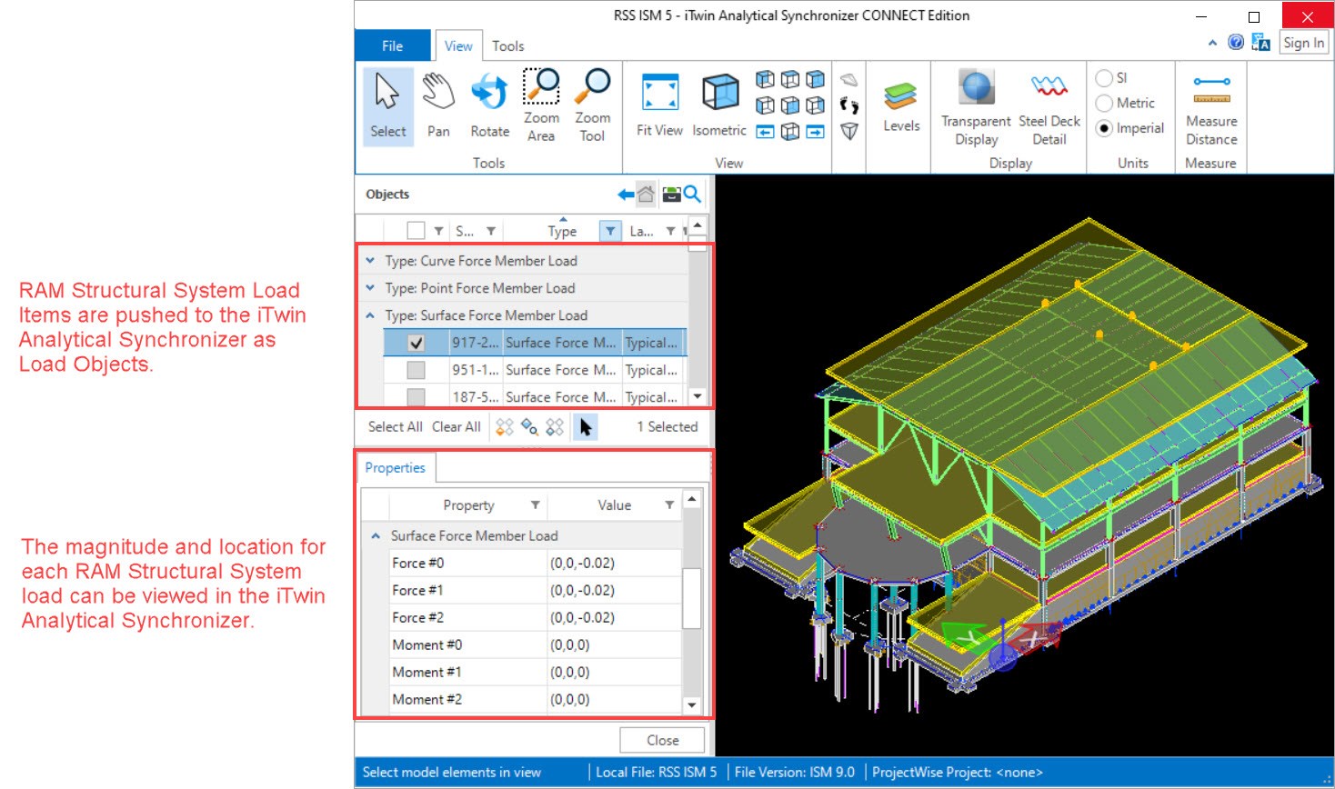 The Surface Loads, Line Loads, Point Loads, and Snow Loads defined in the RAM Manager Load Property Tables will be pushed to the iTwin Analytical Synchronizer as Load Objects.