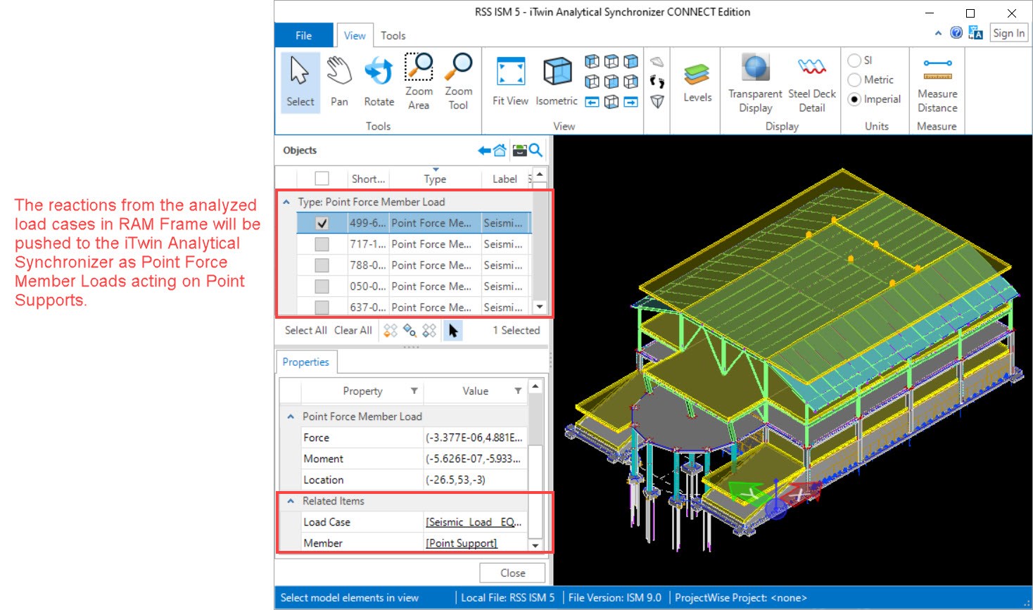 The story forces for each RAM Frame analyzed load case will not be pushed the iTwin Analytical Synchronizer, but the resulting reactions from each analyzed load case will be pushed to the iTwin Analytical Synchronizer as Point Force Member Loads acting on Point Supports.