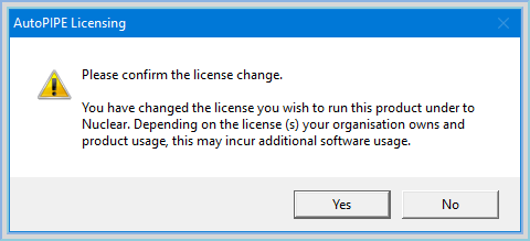 Confirm available license in BLT. There are no settings in AutoPIPE to limit licensing access to any edition of the software (Standard, Advance, or Nuclear); users must exercise restraint. Another options is for your company appointed Bentley On-Site Administrators to set up license alerting: