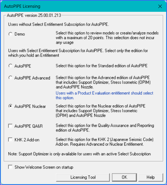 The AutoPIPE Licensing dialog (which is also referred to as the Configuration dialog) will automatically display when AutoPIPE is launched for the first time after installation, or whenever the "Show Welcome Screen on startup" checkbox is checked in the lower left corner of the dialog. AutoPIPE will initially operate in Demo mode, The user is required to minimally select an edition setting (Standard, Advanced, or Nuclear) before continuing with their current work session. If it is not clear which option should be chosen, contact your company's Bentley On-site Administrator(s) for assistance.