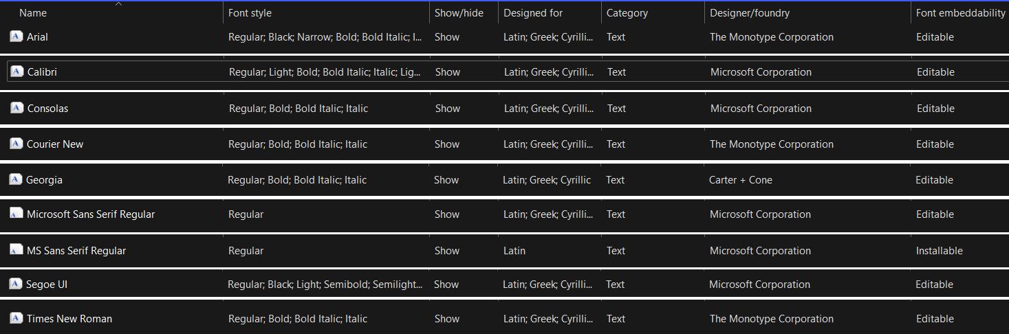 d. Are all of the font filles mentioned above listed in the C:/ Windows/Fonts folder?