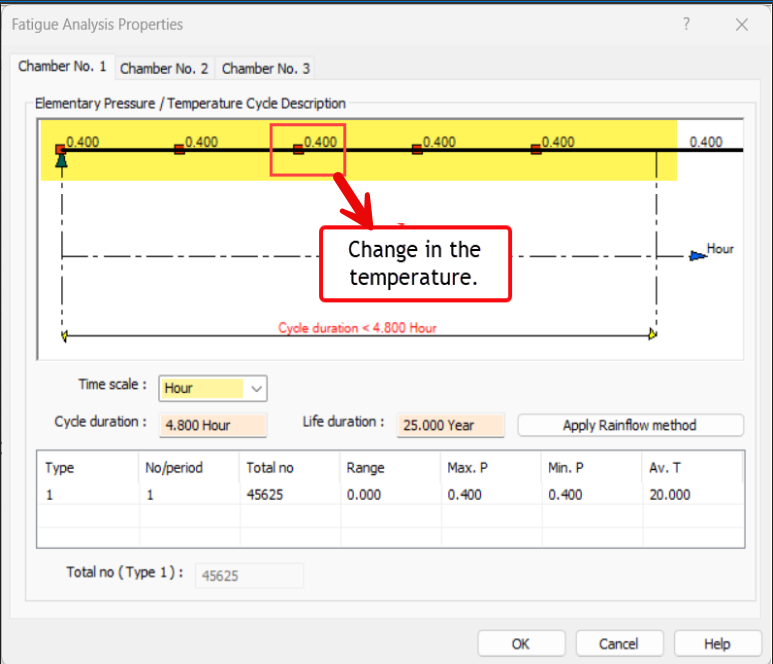 The fatigue curve defined by the user appears to be inconsistent. Specifically, no change in pressure has been provided for Chamber 1, while a change in temperature value is present.