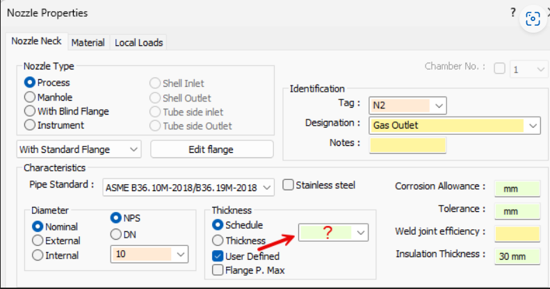 In addition, check the following missing thickness information on the Nozzle Properties dialog contains a value when set to User Defined: