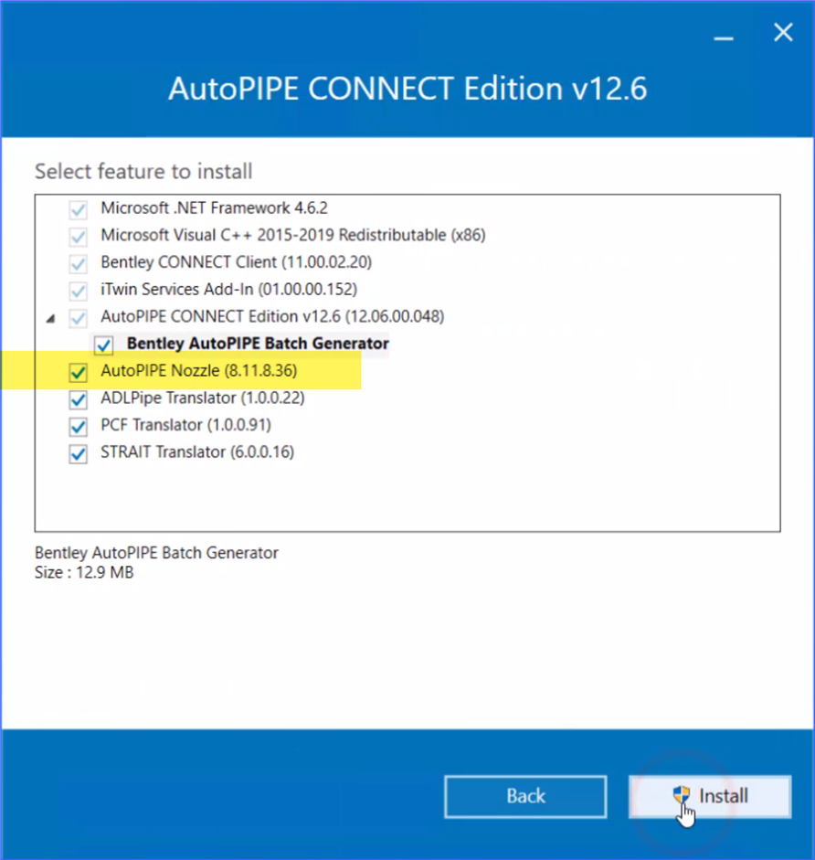 Note, AutoPIPE Nozzle installation option was removed in AutoPIPE 12.08.05 and higher. The only way to install AutoPIPE Nozzle is using instructions here.