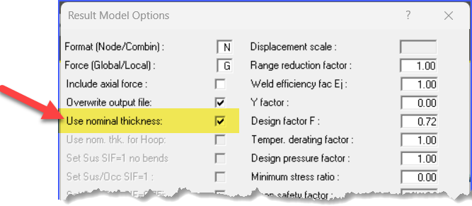 In some cases, enabling this setting may result in reduced forces and moments; however, the majority of piping codes require the use of nominal thickness for flexibility analysis. Following any modification to this setting, one may consider it essential to re-analyze the model.