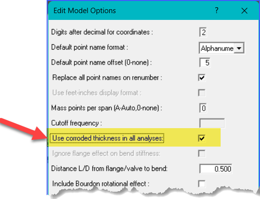 In conclusion, "Use corroded thickness in analysis" enabled would impact everything; Forces, Moments, Displacements, to be more flexible in both Static and Dynamic analysis. However this setting does not impact the Code calculations. That job is reserved for the "Use nominal thickness" and " User nom, thk for Hop" options.
