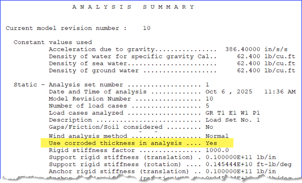 Setting shown in Output report, Analysis Summary section: "Use corroded thickness in analysis"