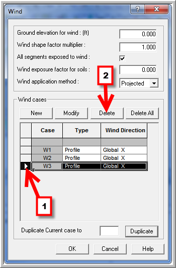 1. A Wind load case W3 is deleted from the model using the Wind dialog screen, selecting the Load case W3 and pressing the Delete button.