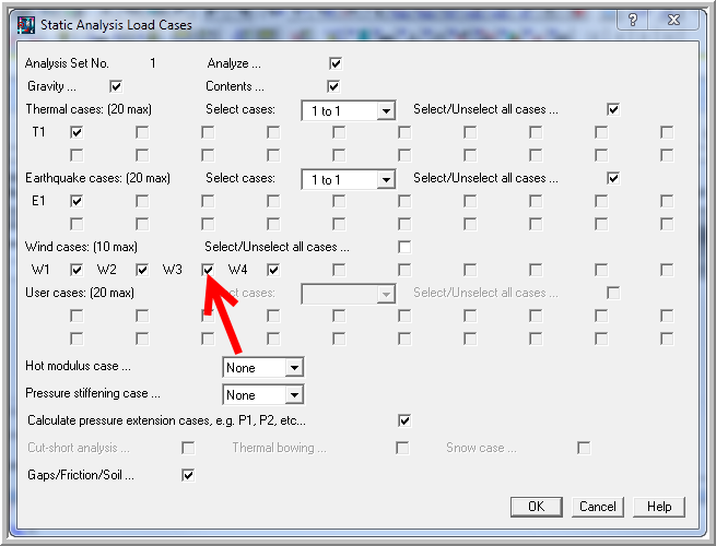 Load case W3 is added and removed from a Static Analysis set by enabling / disabling the check box next to the load case on the Static analysis Load set dialog screen, shown below: